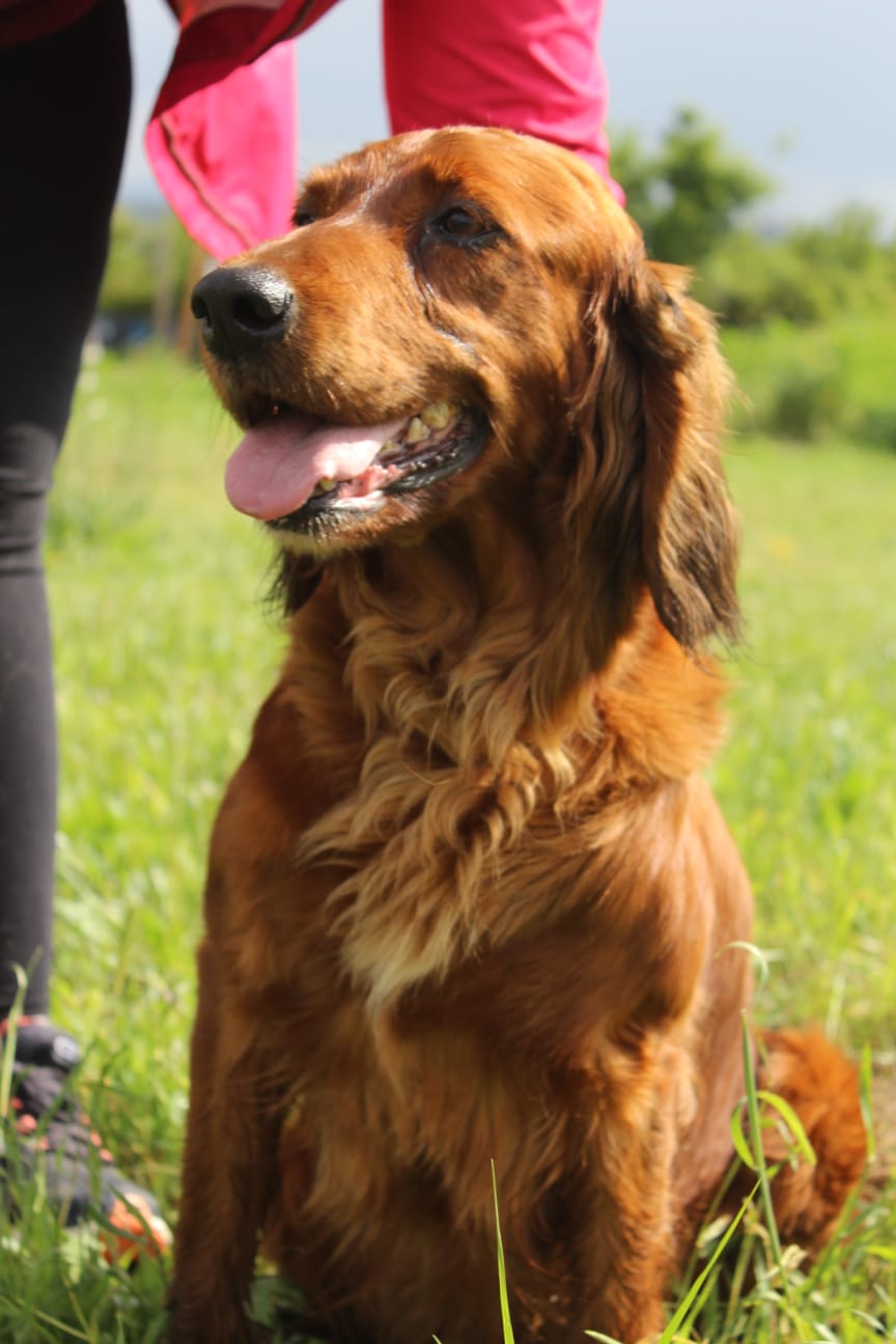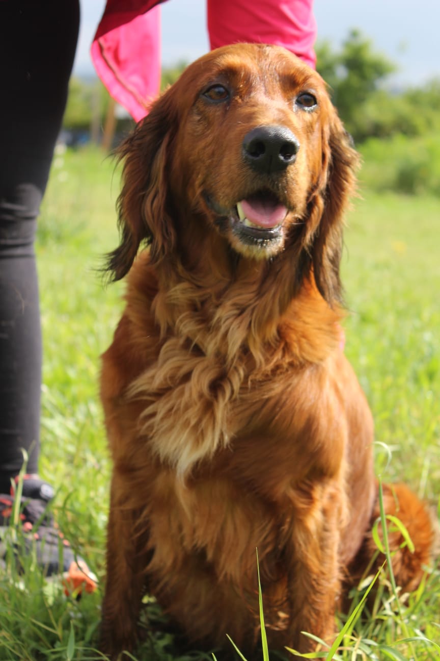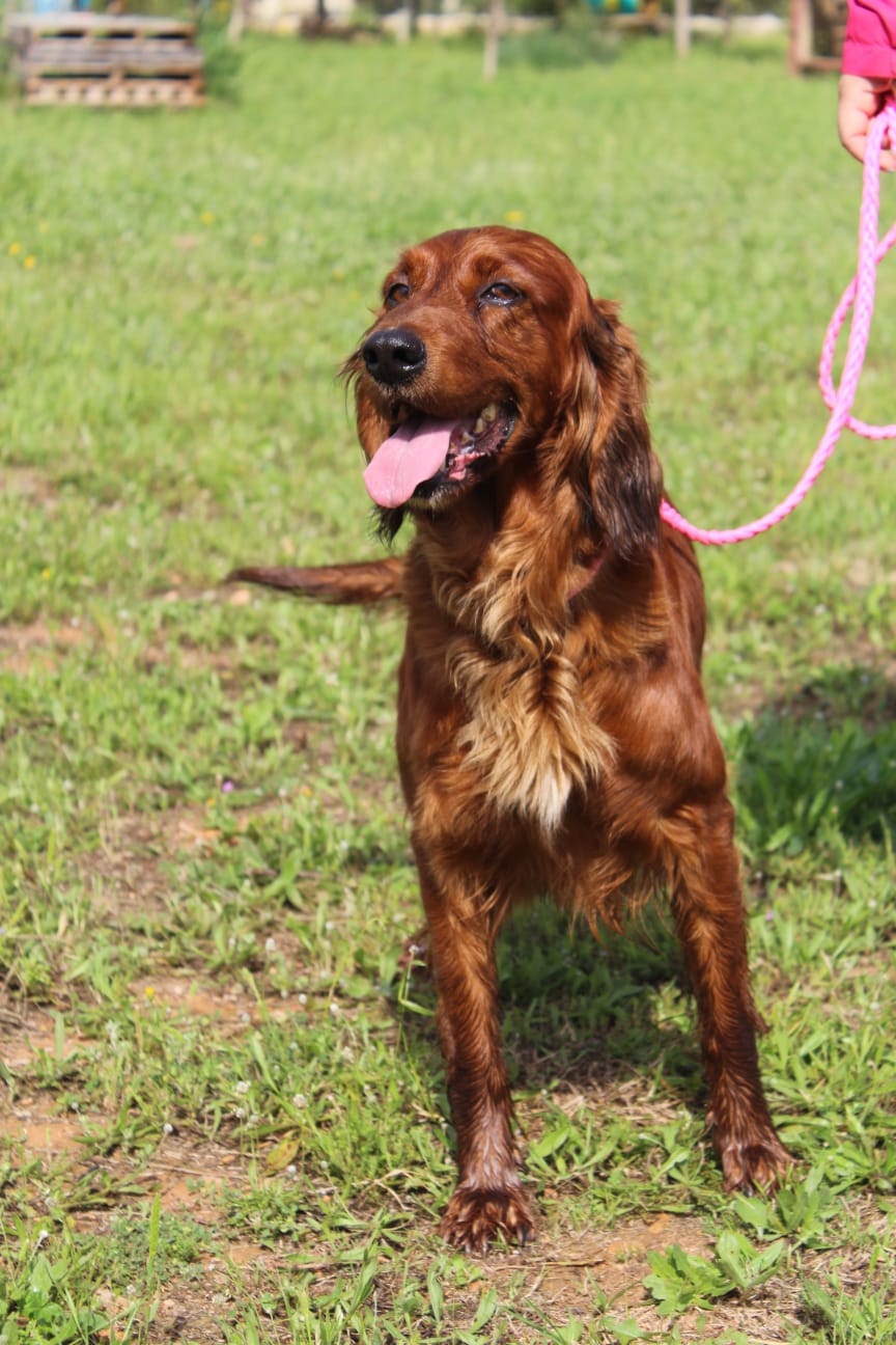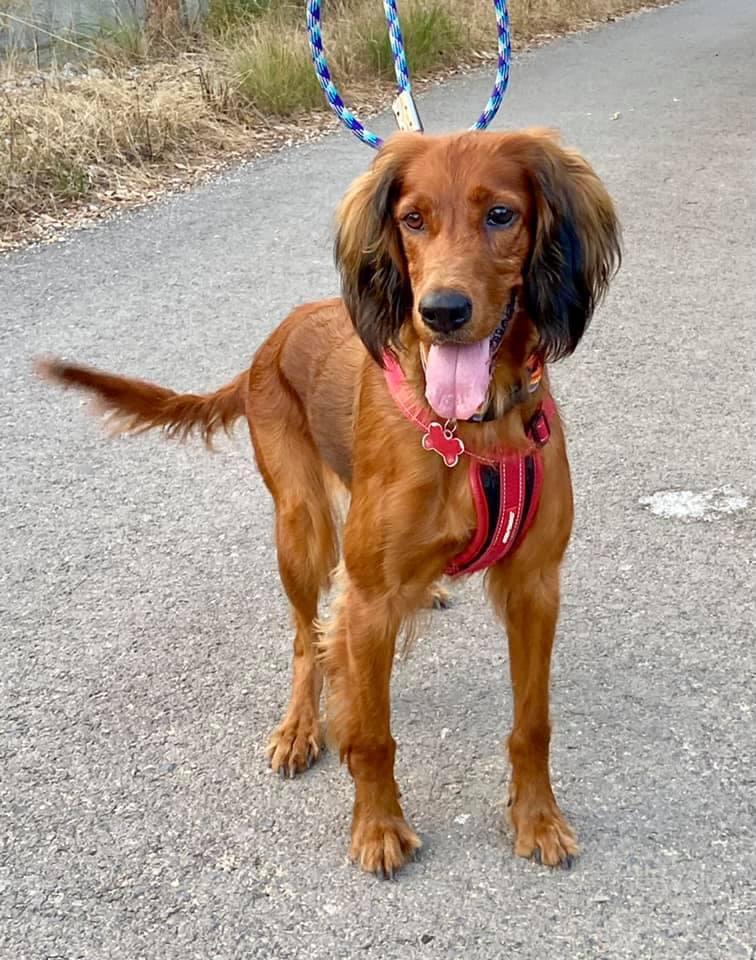 Ruby apareció por unos chalets en una urbanización, es una setter irlandés, posiblemente pura. Inexplicable con lo preciosa que es y sin microchip. La recogimos y encontramos una perra super cariñosa y muy buena pero con la sorpresa de que estaba preñada, a los pocos días parió tres cachorritos. Los crio con esmero y al tiempo encontraron adopciones. Luego ella ha sido esterilizada. Se quedó esperando una buena familia. Es bastante sumisa y puede convivir con otros perros pero no merece que la dominen ni se metan con ella, mientras es alegre y tranquila y muchísimo cariñosa y dulce
