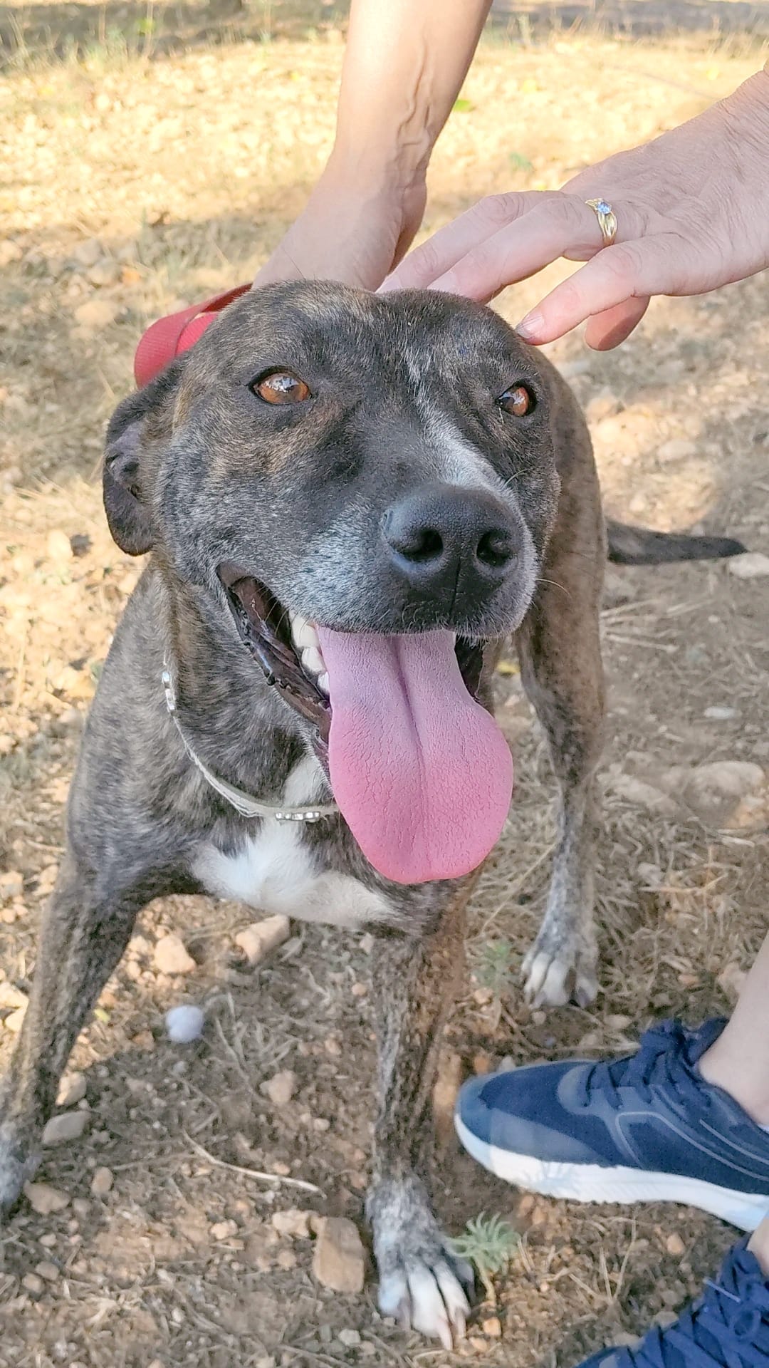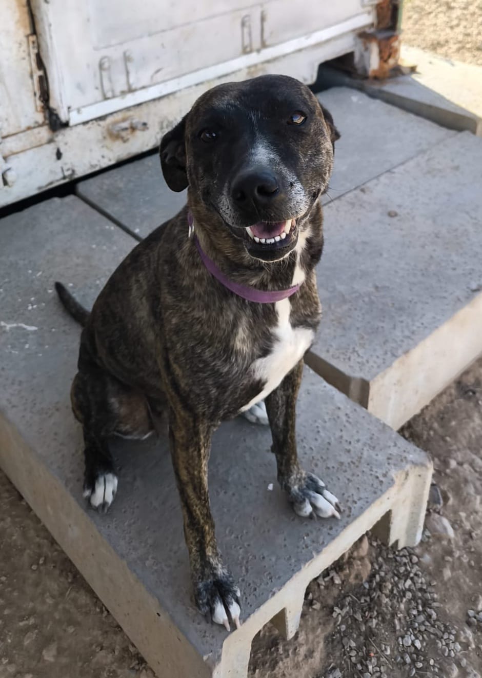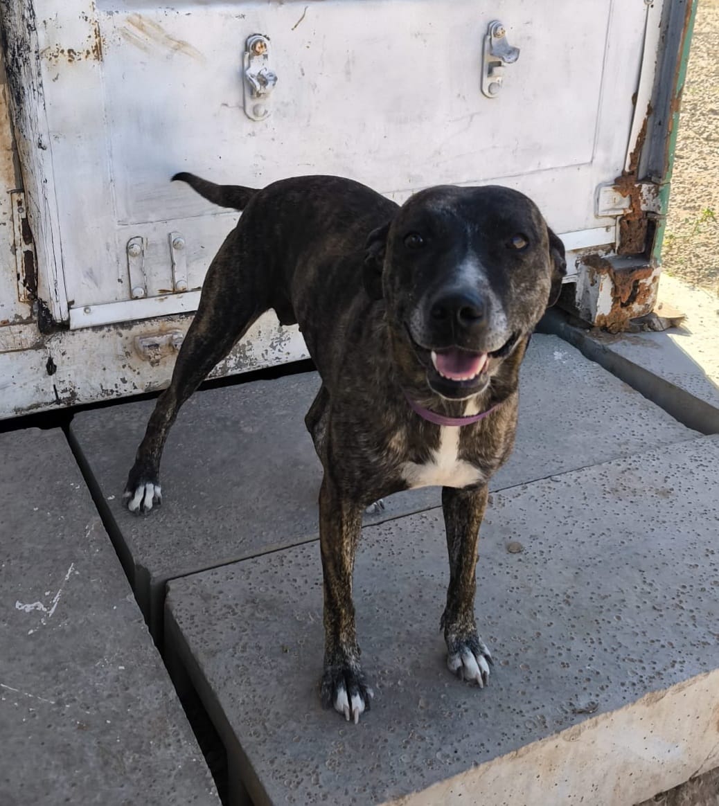 Es una perrita de tamaño mediano, jovencita de 4 años, muy simpática y de muy buen carácter, juguetona y cariñosa. Iba perdida por la carretera en compañía de otro perro y fueron rescatados ante el peligro de atropello, sin ninguna identificación ni nadie los reclamó. Su piel jaspeada confunde, no es ppp, solo mestiza.